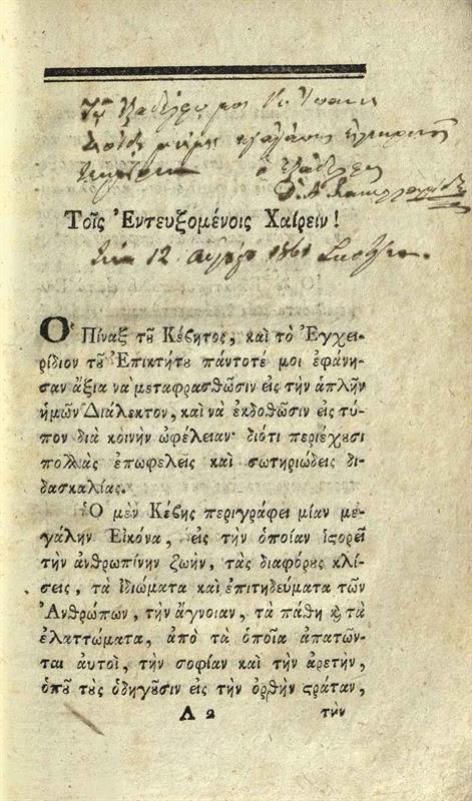 Δημήτριος Ν. Δάρβαρης. Χρυσοῦν Ἐγκόλπιον ἤτοι Κέβητος Θηβαίου Πίναξ καὶ Ἐπικτήτου Ἐγχειρίδιον Μεταφρασθέντα ἐκ τῆς ἑλληνικῆς εἰς τὴν καθ’ ἡμᾶς κοινοτέραν διάλεκτον μετά τινων σημειωμάτων... καὶ Σχεδίασμα περὶ τῶν Καθηκόντων... καὶ ἐκδοθέντα ὑπὸ... Ἰωάννου Νικολάου τοῦ Δαρβάρεως..., Βιέννη, 1799.