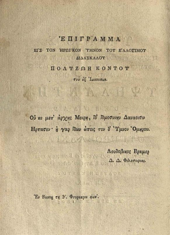 Πολυζώης Κοντός, Ὕμνος εἰς τὸν --- Ἰωάννην Κωνσταντίνον Ἀλεξάνδρου Υψηλάντην, Βιέννη, 1805.