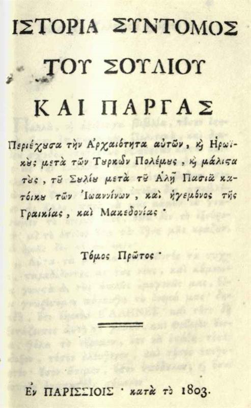 [Χριστόφορος Περραιβός]. Ἱστορία Σύντομος τοῦ Σουλίου καὶ Πάργας..., τ. Α´, Παρίσι [= Λιβόρνο], 1803.