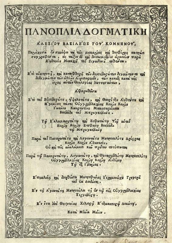 Εὐθύμιος Ζιγαβηνός. Πανοπλία Δογματικὴ Ἀλεξίου Βασιλέως τοῦ Κομνηνοῦ περιέχουσα ἐν συνόψει τὰ τοῖς... πατράσι συγγραφέντα..., Τεργόβιστε Οὐγγροβλαχίας, Μάιος 1710.