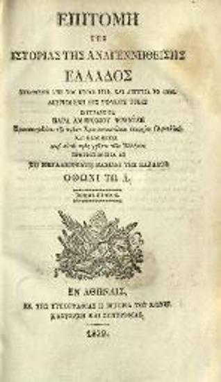 Ἀμβρόσιος Φραντζῆς. Ἐπιτομὴ τῆς Ἱστορίας τῆς ἀναγεννηθείσης Ἑλλάδος ἀρχομένη ἀπὸ τοῦ ἔτους 1715, καὶ λήγουσα τὸ 1835..., Ἀθήνα, τ. Α´-Β´, ἐκ τῆς Τυπογραφίας Ἡ Βιτώρια τοῦ Κωνστ. Καστόρχη καὶ συντροφίας, 1839, τ. Γ´-Δ´, ἐκ τῆς Τυπογραφίας Κ. Ράλλη, 1841.