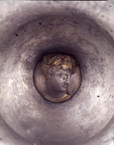 Ανάγλυφο επίχρυσο κεφάλι γυναίκας στο εσωτερικό ασημένιου κάλυκα