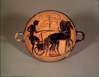 Μελανόμορφη κύλικα με παράσταση αναβάτη και άρματος στο εσωτερικό
