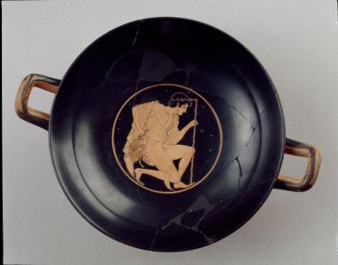 Πήλινο αγγείο. Ερυθρόμορφη κύλικα. Νέος με λαγό