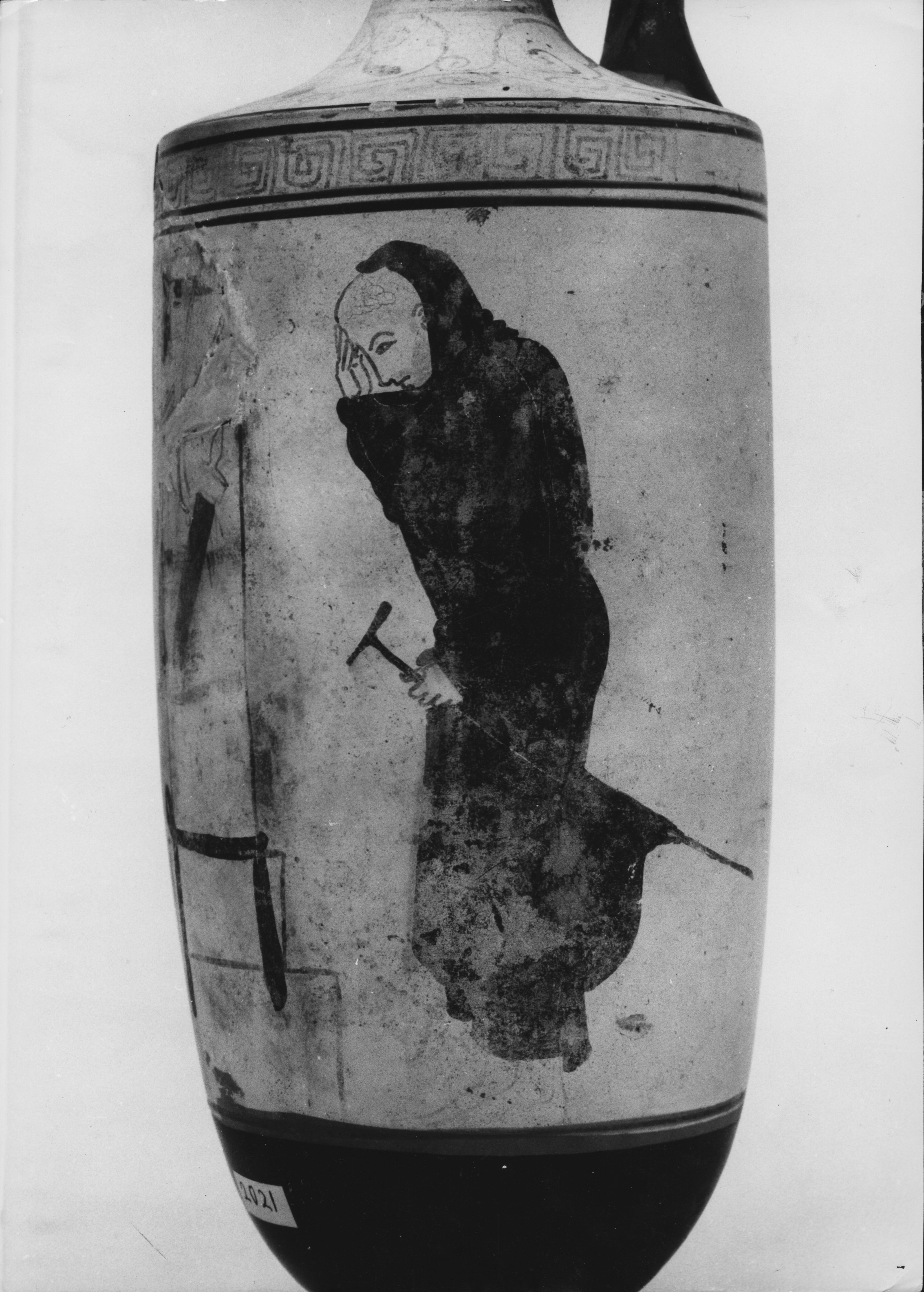 Αττική λευκή λήκυθος. Επίσκεψη ηλικιωμένης γυναίκας σε τάφο.