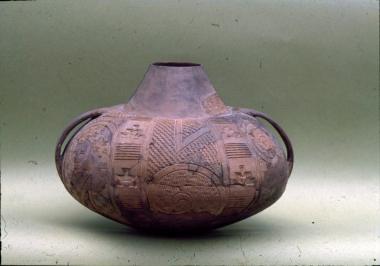Πήλινος σφαιρικός αμφορίσκος με έντυπη και εγχάρακτη διακόσμηση από το Διμήνι.
