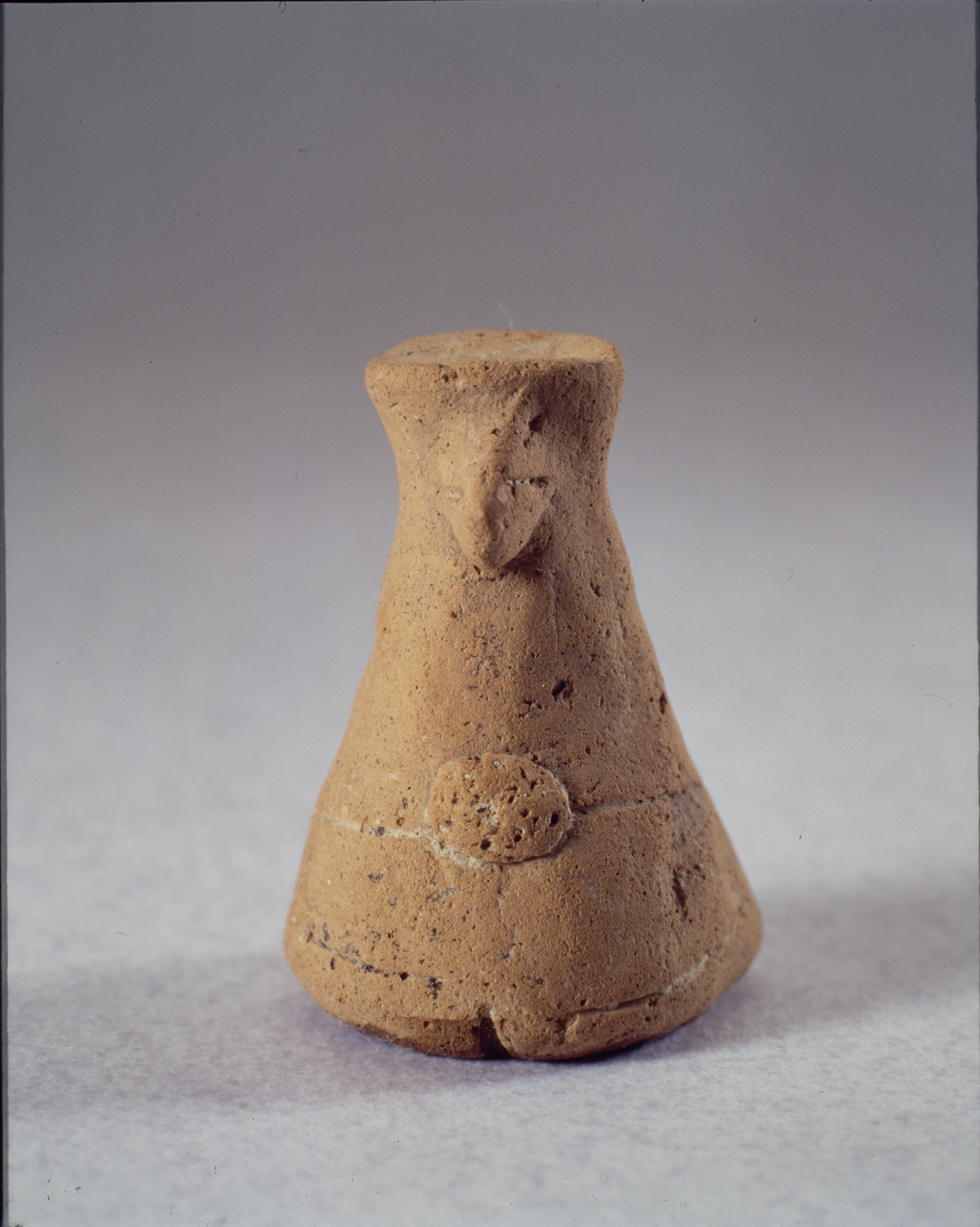 Πήλινο ειδώλιο γυναικείας μορφής σχηματοποιημένο με πόρπη στη μέση. Από τη Θεσσαλία (εμπρόσθια όψη).