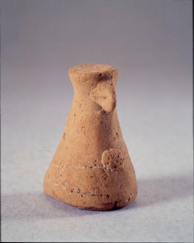 Πήλινο ειδώλιο γυναικείας μορφής σχηματοποιημένο με πόρπη στη μέση. Από τη Θεσσαλία (όψη 3/4).