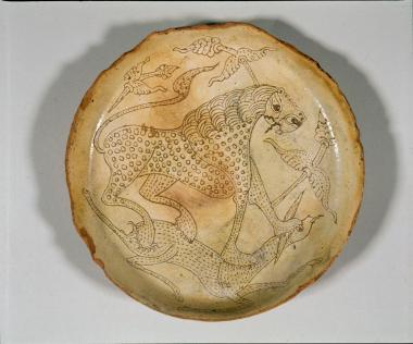 Εφυαλωμένο πινάκιο με παράσταση λιονταριού που σπαράζει ελάφι από το ναυάγιο Πελαγοννήσου-Αλοννήσου