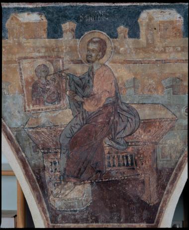 Ο ευαγγελιστής Λουκάς ζωγραφίζει την εικόνα της Θεοτόκου. Αποτοιχισμένη τοιχογραφία από τον κατεδαφισμένο ναό της Αγίας Βαρβάρας.