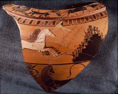 Όστρακο από μελανόμορφο δίνο του Σοφίλου με παράσταση των άθλων επί Πατρόκλω.