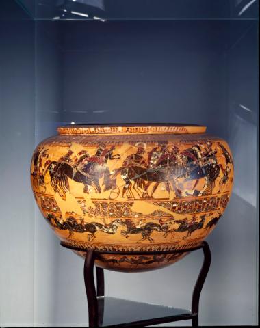Ζ. Της Ακρόπολης 606. Μελανόμορφος δίνος με παράσταση ομηρικής μάχης.