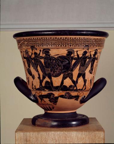 Εργαστήριο Εξηκία. Καλυκόσχημος κρατήρας με παράσταση μάχης Ελλήνων και Τρώων γύρω από το νεκρό Πάτροκλο.
