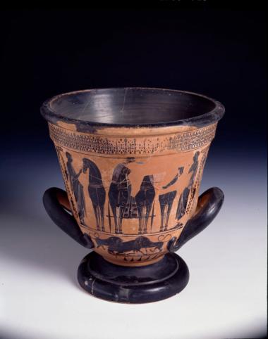 Εργαστήριο Εξηκία. Καλυκόσχημος κρατήρας με παράσταση τεθρίππου κατενώπιον.