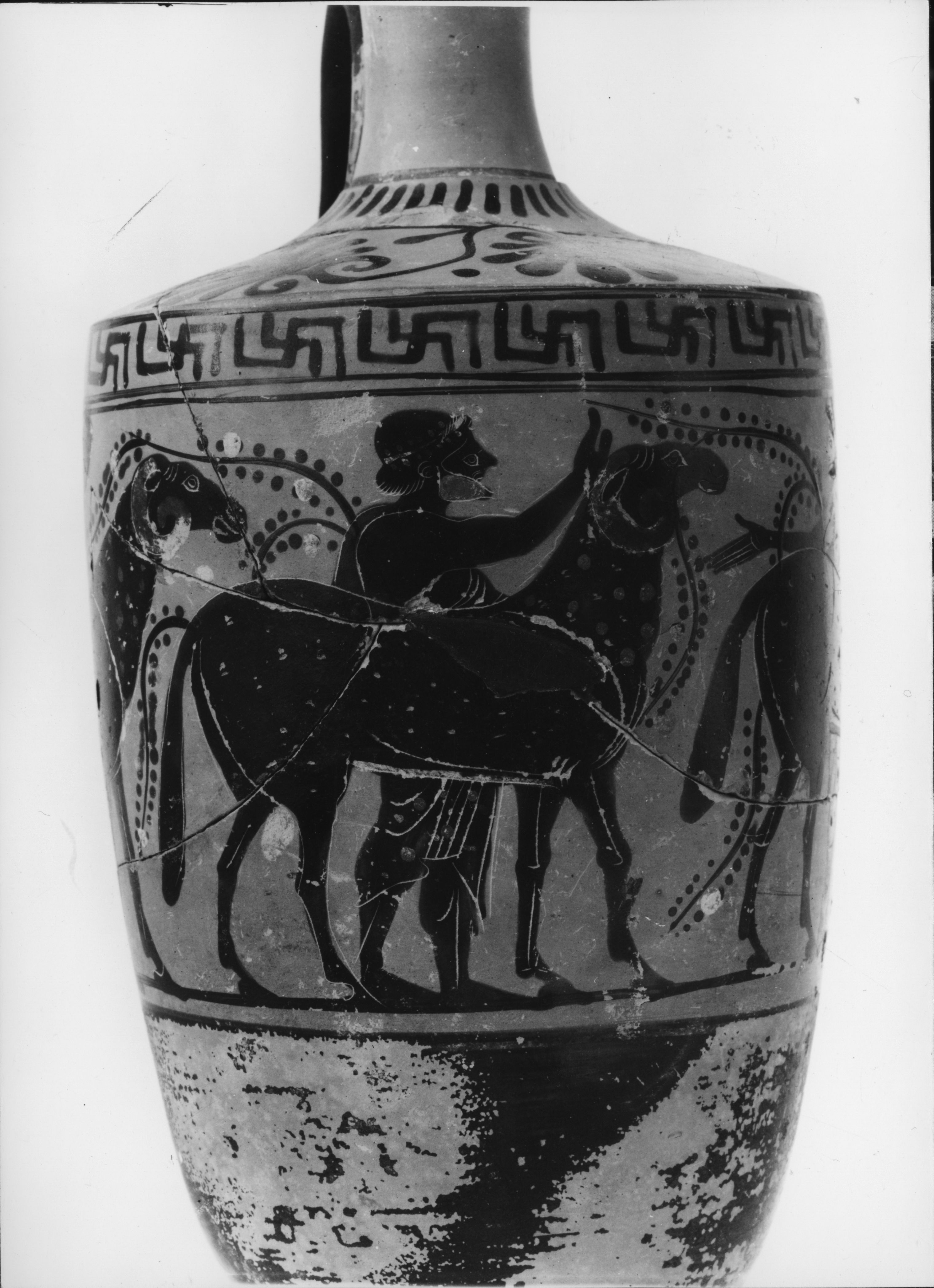 Ζ. Της Γέλας. Μελανόμορφη λήκυθος. Άνδρας που οδηγεί πρόβατα.