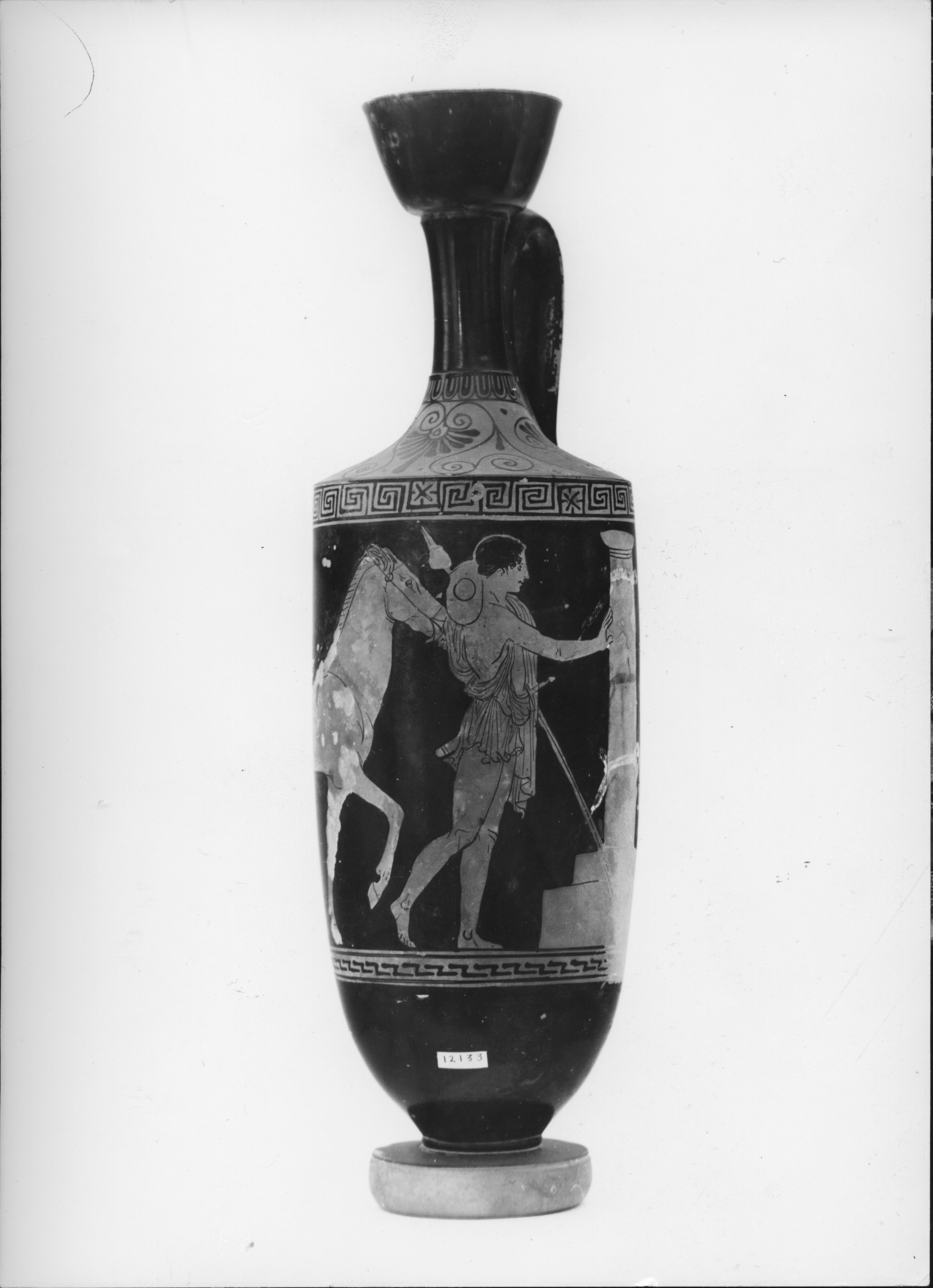 Ζ. Αχιλλέως. Ερυθρόμορφη λήκυθος με παράσταση ήρωος ιππέως μπροστά σε ταφικό μνημείο.
