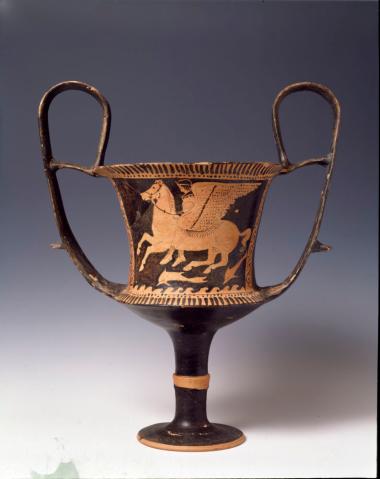 Βοιωτικός ερυθρόμορφος κάνθαρος. Νέος ιππεύει φτερωτό άλογο πάνω από θάλασσα.