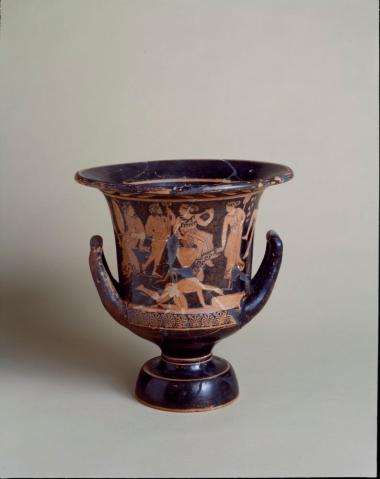 Αττικός ερυθρόμορφος καλυκωτός κρατήρας. Αμυμώνη, Ποσειδώνας, Διονυσιακός θίασος.