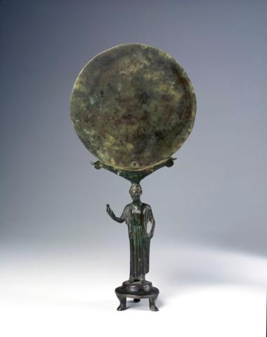 Χάλκινο κάτοπτρο με λαβή αγαλμάτιο πεπλοφόρου κόρης.