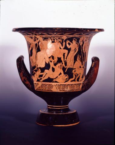 Αττικός ερυθρόμορφος καλυκωτός κρατήρας. Αμυμώνη, Ποσειδώνας, Διονυσιακός θίασος.
