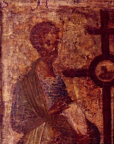 Εικόνα αμφιπρόσωπη. Α΄ όψη: απόστολοι Πέτρος και Παύλος. Λεπτομέρεια. Β΄ όψη: Σταυρός