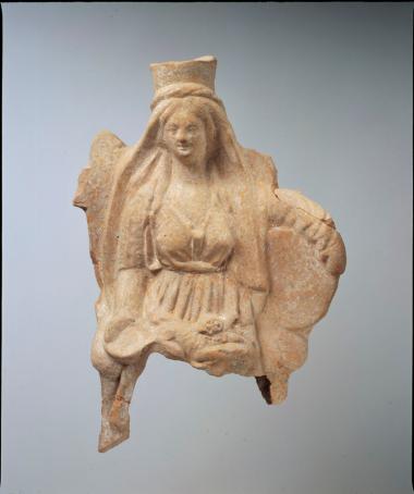 Δημητριάδα. Πήλινο ειδώλιο της Μητέρας των Θεών με τα χαρακτηριστικά σύμβολα της φρυγικής θεάς Κυβέλης. Κρατά τύμπανο και φιάλη.