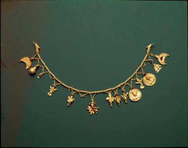 Χρυσό περιδέραιο με εξαρτημένους γύπες, ερωτιδείς, νίκες, μετάλλια από το Πελινναίο Τρικάλων.