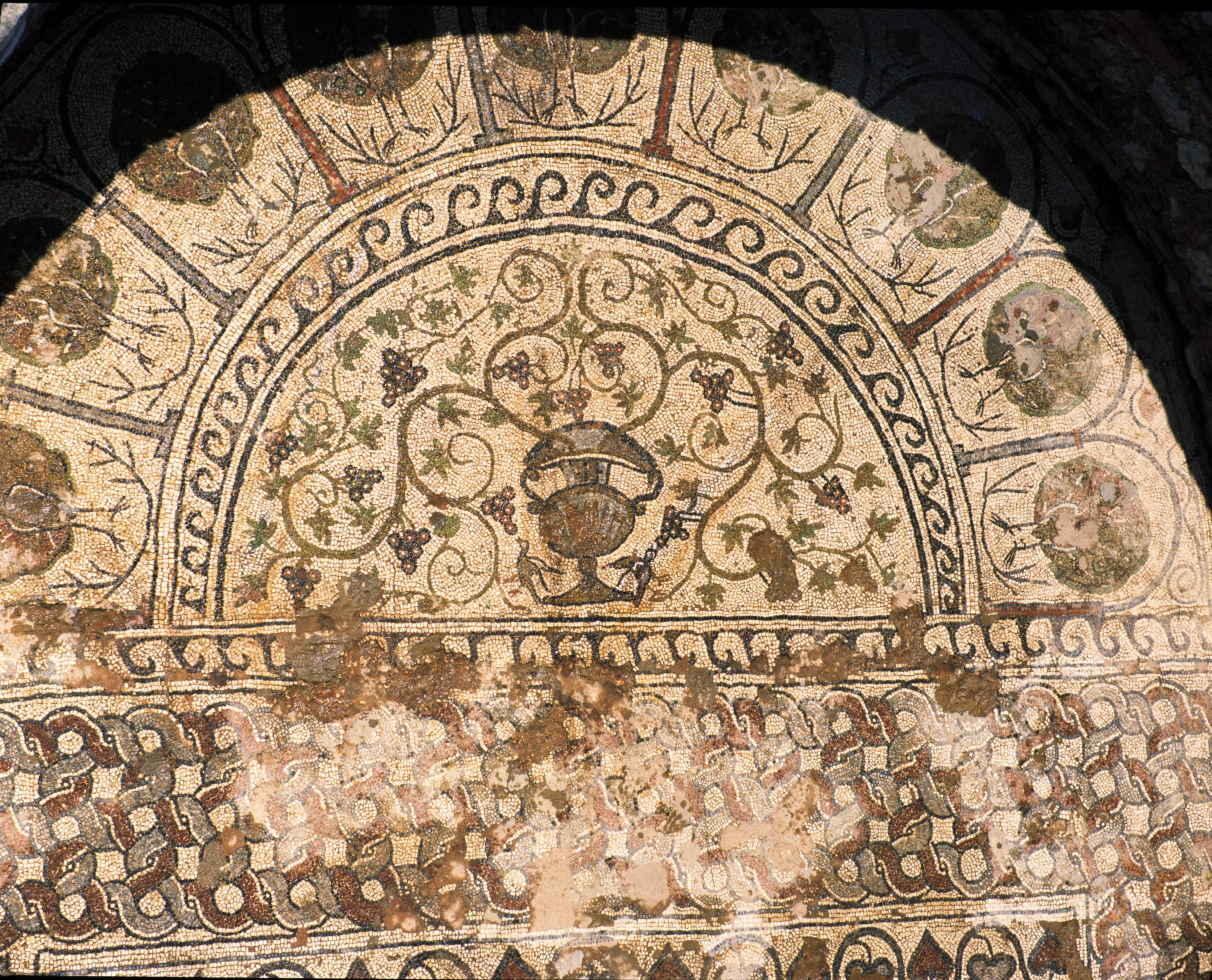 Βασιλική Α (Δουμετίου). Ψηφιδωτό δάπεδο στο αψιδωτό κτίσμα του διακονικού, λεπτομέρεια.