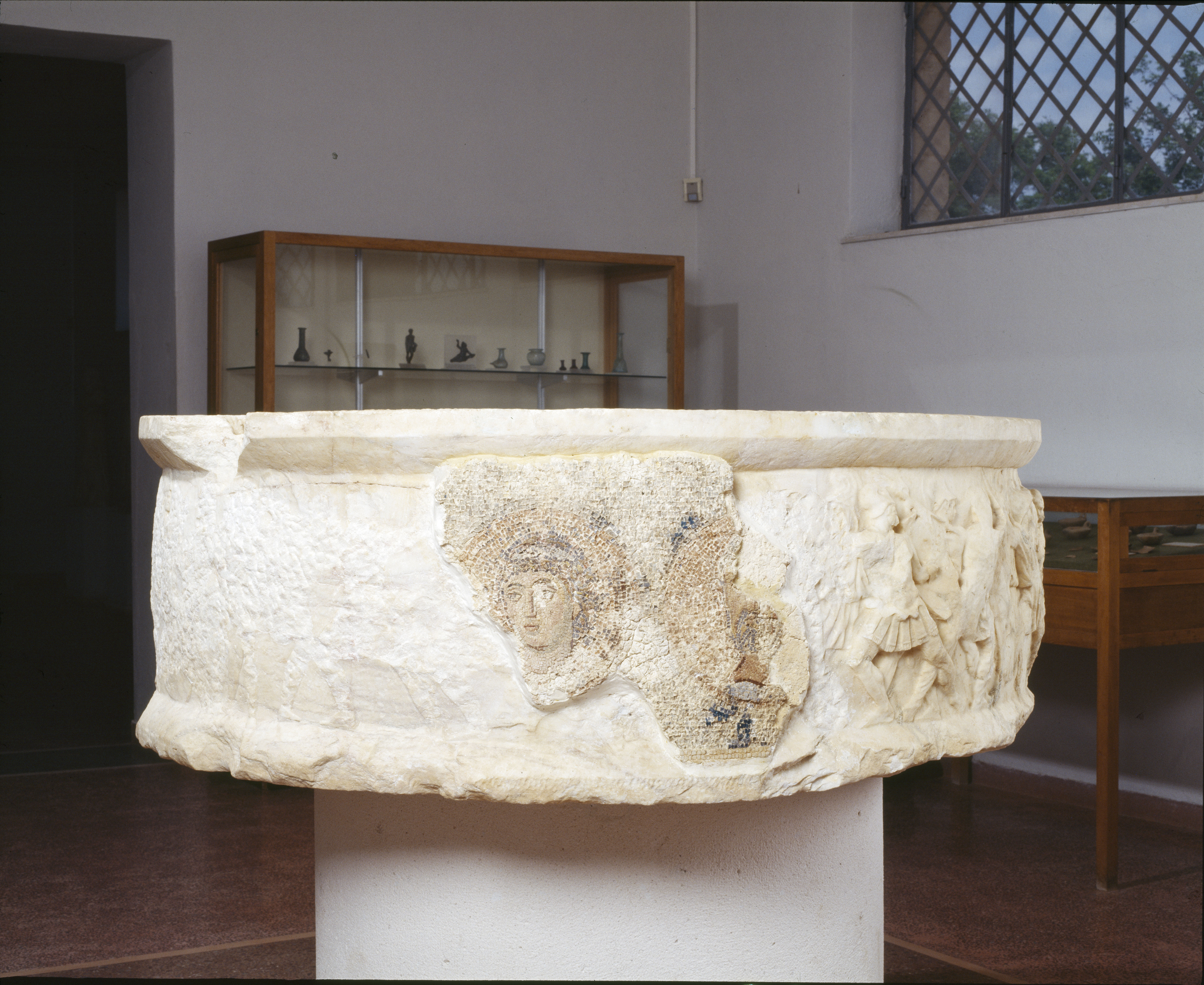 Μαρμάρινο κυλινδρικό βάθρο ανδριάντα με ανάγλυφη παράσταση αμαζονομαχίας. Την παράσταση αντικατέστησαν σε ένα μέρος οι χριστιανοί με ψηφιδωτό που εικονίζει δύο μορφές σε προτομή μέσα σε εγκόλπια.