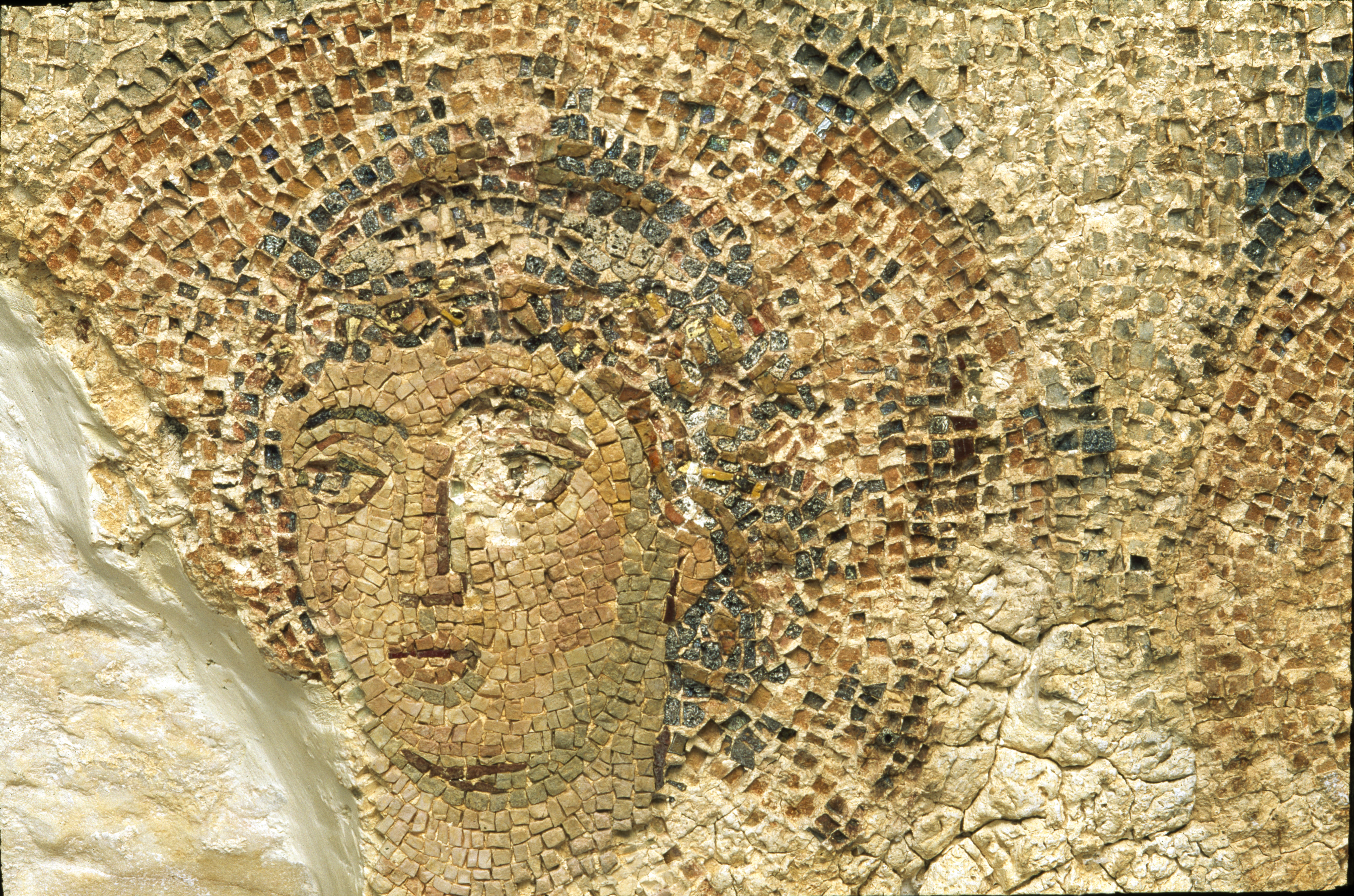 Μαρμάρινο κυλινδρικό βάθρο ανδριάντα με ανάγλυφη παράσταση αμαζονομαχίας. Την παράσταση αντικατέστησαν σε ένα μέρος οι χριστιανοί με ψηφιδωτό που εικονίζει δύο μορφές σε προτομή μέσα σε εγκόλπια (λεπτομέρεια).