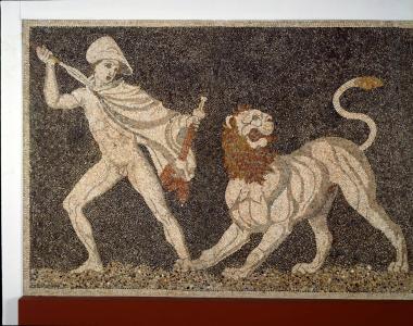 Ψηφιδωτό δάπεδο με παράσταση κυνηγιού λέοντα, λεπτομέρεια