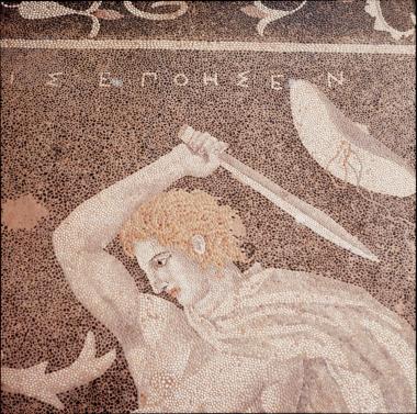 Ψηφιδωτό δάπεδο με παράσταση κυνηγιού ελάφου, έργο του Γνώσιος, λεπτομέρεια