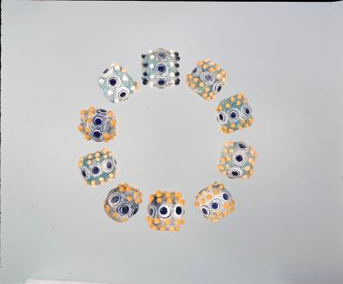 Γυάλινες πολύχρωμες οφθαλμωτές και πεπονοειδείς διάτρητες ψήφοι σχεδόν σφαιρικού σχήματος