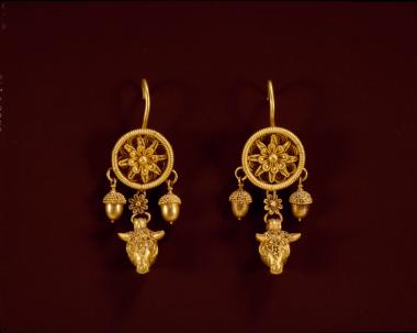 Χρυσά ενώτια με ταυροκεφαλή και καρπούς βελανιδιάς