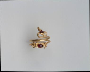 Χρυσό φιδόσχημο δαχτυλίδι με γρανάτη.
