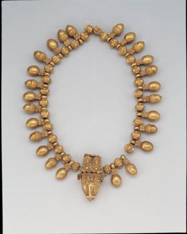 Χρυσό περιδέραιο με έκτυπη, συρματερή και κοκκιδωτή τεχνική.