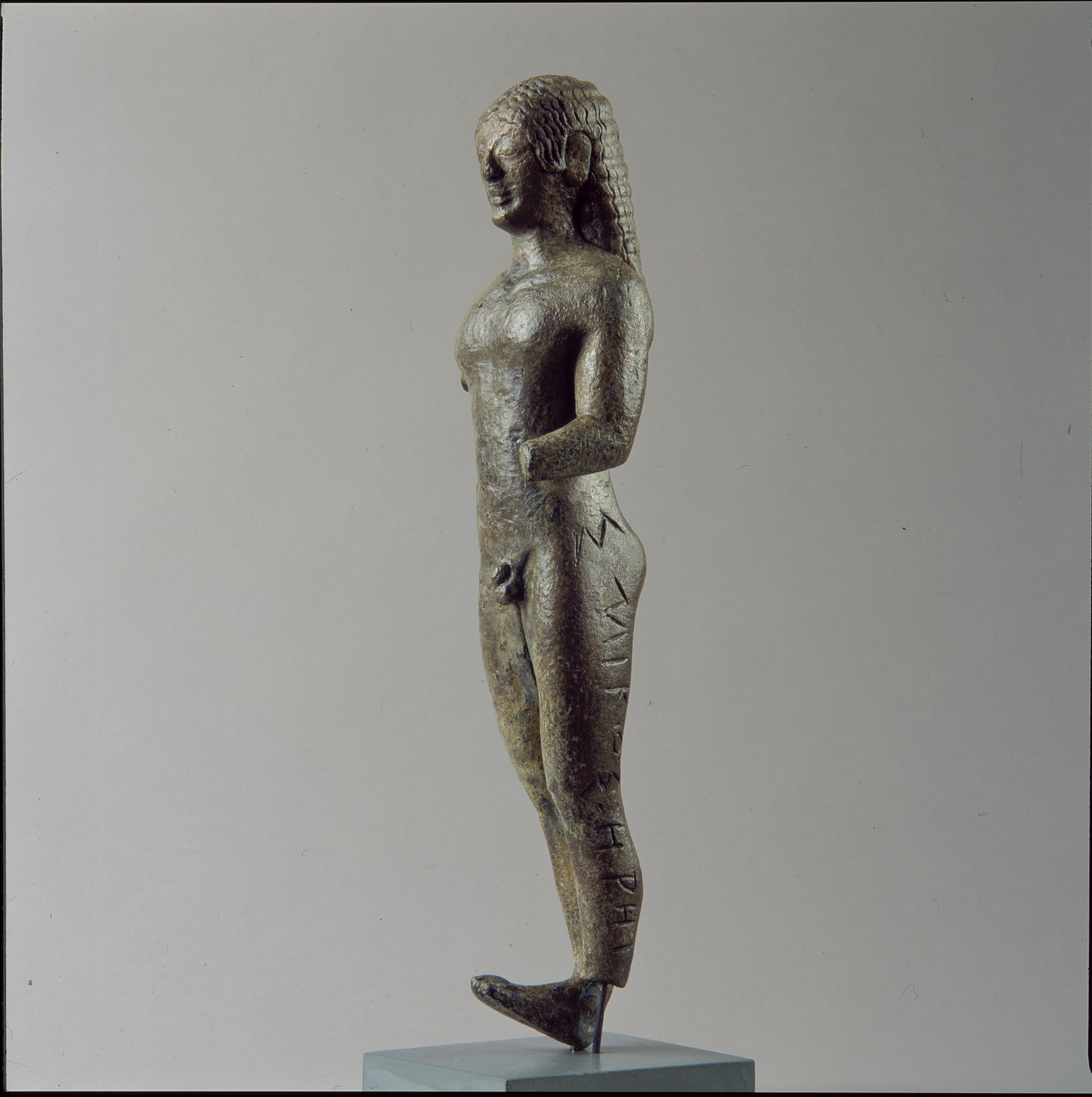 Χάλκινος κούρος με επιγραφή στο αριστερό πόδι "ΣΜΙΚΡΟΣ ΗΡΗΙ"