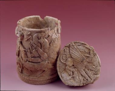 Πυξίδα από ελεφαντοστό με ανάγλυφη διακόσμηση γρυπών που σπαράσσουν ελάφι