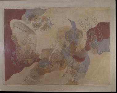 Η τοιχογραφία του Γαλάζιου Πουλιού σε τοπίο με βράχια, άγρια ρόδα και ίριδες