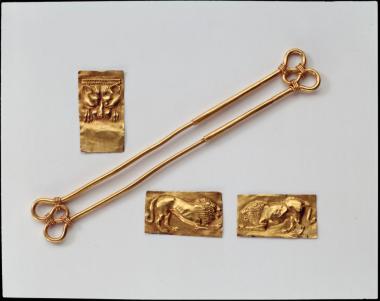 Διπλή χρυσή περόνη και τρία χρυσά πλακίδια