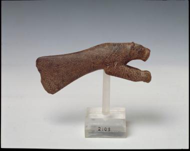 Απόληξη-λαβή σκήπτρου από πράσινο σχιστόλιθο σε σχήμα πάνθηρα και πελέκεως