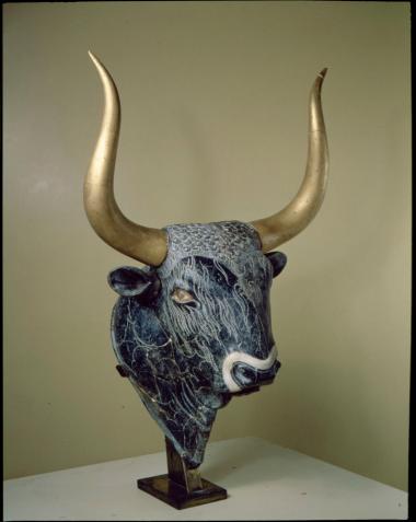 Ρυτό σε σχήμα κεφαλής ταύρου από οφείτη με ενθέσεις στο ρύγχος και στα μάτια από μάργαρο, ερεία κρύσταλλο και ίασπι