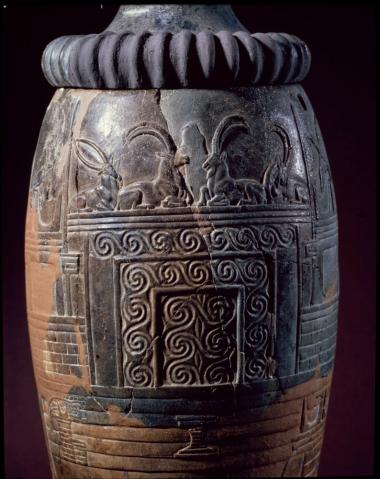 Ωοειδές ρυτό από στεατίτη με παράσταση υπαίθριου τεμένους με κέρατα καθοσιώσεως