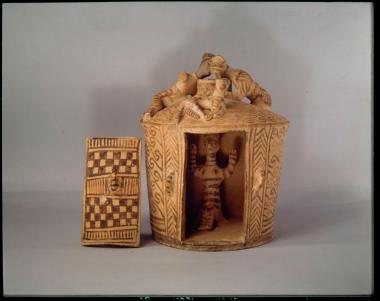 κυκλικός οικίσκος με θύρα που κλείνει με θυρόφυλλο και στο εσωτερικό καθιστή μορφή θεάς με υψωμένα χέρια