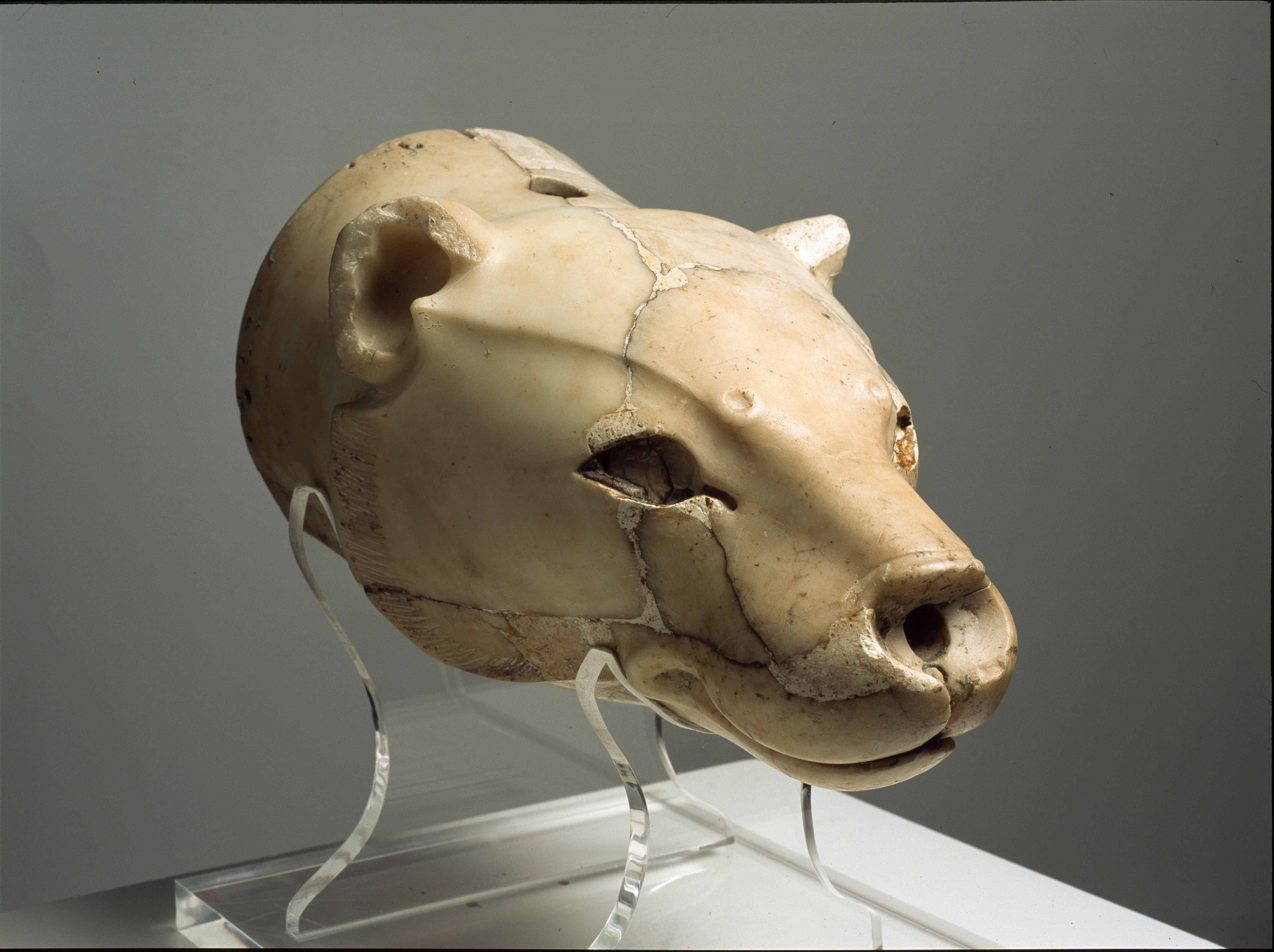 ρυτό σε σχήμα κεφαλής λέαινας από υπόλευκο ημιδιάφανο ασβεστόλιθο