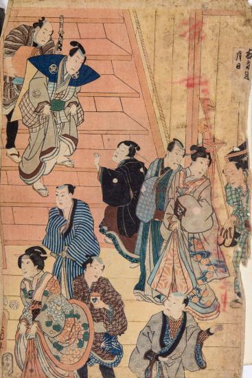 Η συγκεκριμένη γιαπωνέζικη ξυλογραφία αποτελεί το κεντρικό τμήμα μιας ευρύτερης παράστασης όπου εικονίζονται τα παρασκήνια ενός θεάτρου kabuki. Στο τμήμα που βρίσκεται σήμερα στη συλλογή του Μουσείου, μέσω της δωρεάς του Εμμανουήλ Ζέπου, εικονίζονται οι σκάλες που οδηγούν στη σκηνή με ηθοποιούς ντυμένους με χαρακτηριστικά κοστούμια και να κινούνται με ταχύτητα για να προλάβουν τη σειρά τους. Η χαρακτική, όπως και οι υπόλοιπες τέχνες, εισήχθη στην Ιαπωνία από την Κίνα. Η περίοδος Έντο, όταν η πρωτεύουσα μεταφέρθηκε από το Κιότο στο Έντο –το σημερινό Τόκυο– οδήγησε στην εμφάνιση μιας νέας, αστικής τέχνης, της έγχρωμης ξυλογραφίας, που πήρε την ονομασία ukiyo-e (ουκιγιό-ε). Ουκιγιό-ε και σημαίνει «εικόνες του ευμετάβλητου κόσμου». Τα θέματα των χαρακτών αυτών ήταν εμπνευσμένα από την καθημερινή ζωή και ειδικά από το Shin Yoshiwara (Σιν-Γιοσιβάρα), ένα προάστιο γεμάτο οίκους ανοχής και νυχτερινά κέντρα. Εκεί δημιουργήθηκαν νέα είδη τέχνης, όπως το θέατρο kabuki (καμπούκι, μια νεωτεριστική μορφή αστικής τέχνης). Ηθοποιοί, θεατρικές παραστάσεις, απόψεις της πόλης, γκέισες, πόρνες αλλά και ερωτικές σκηνές αναδείχθηκαν στα κύρια θέματα της χαρακτικής του ουκιγιό-ε. Με βασικά γνωρίσματα το καθαρό σχέδιο και την βιρτουόζικη γραμμή, το πλακάτο χρώμα, το στυλιζάρισμα των μορφών και την έντονη εκφραστικότητα των προσώπων, η ιαπωνική χαρακτική σύντομα αναδείχθηκε σε τέχνη εξαιρετικά υψηλής ποιότητας. Το έργο της συλλογής φιλοτέχνησε ο Utagava Kunisada (Ουτάγκαβα Κουνίσαντα, 1786-1865), ένας από τους πιο παραγωγικούς και δημοφιλείς καλλιτέχνες της περιόδου του Έντο. (EL)