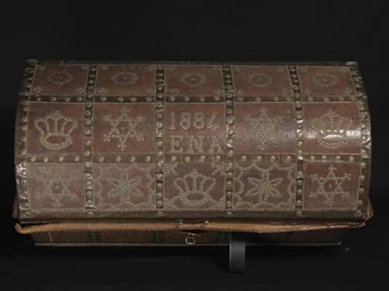 Ξύλινη κασέλα διακοσμημένη με δέρμα, μεταλλικά ελάσματα και καρφιά.