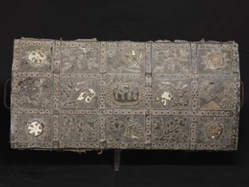 Ξύλινη κασέλα με μεταλλικά ελάσματα και εσωτερική δερμάτινη επένδυση.