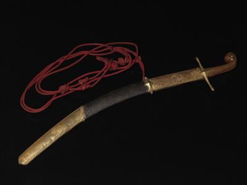 Σπάθα κυρτή, με ξύλινη λαβή, δερμάτινη θήκη και ασημένια επένδυση.