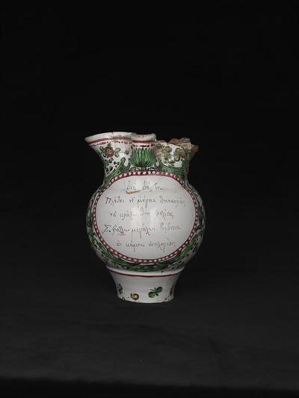 Κανάτα από μαγιόλικα/φαγεντιανή φιλοτεχνήθηκε κατά παραγγελλία ελλήνων εμπόρων.